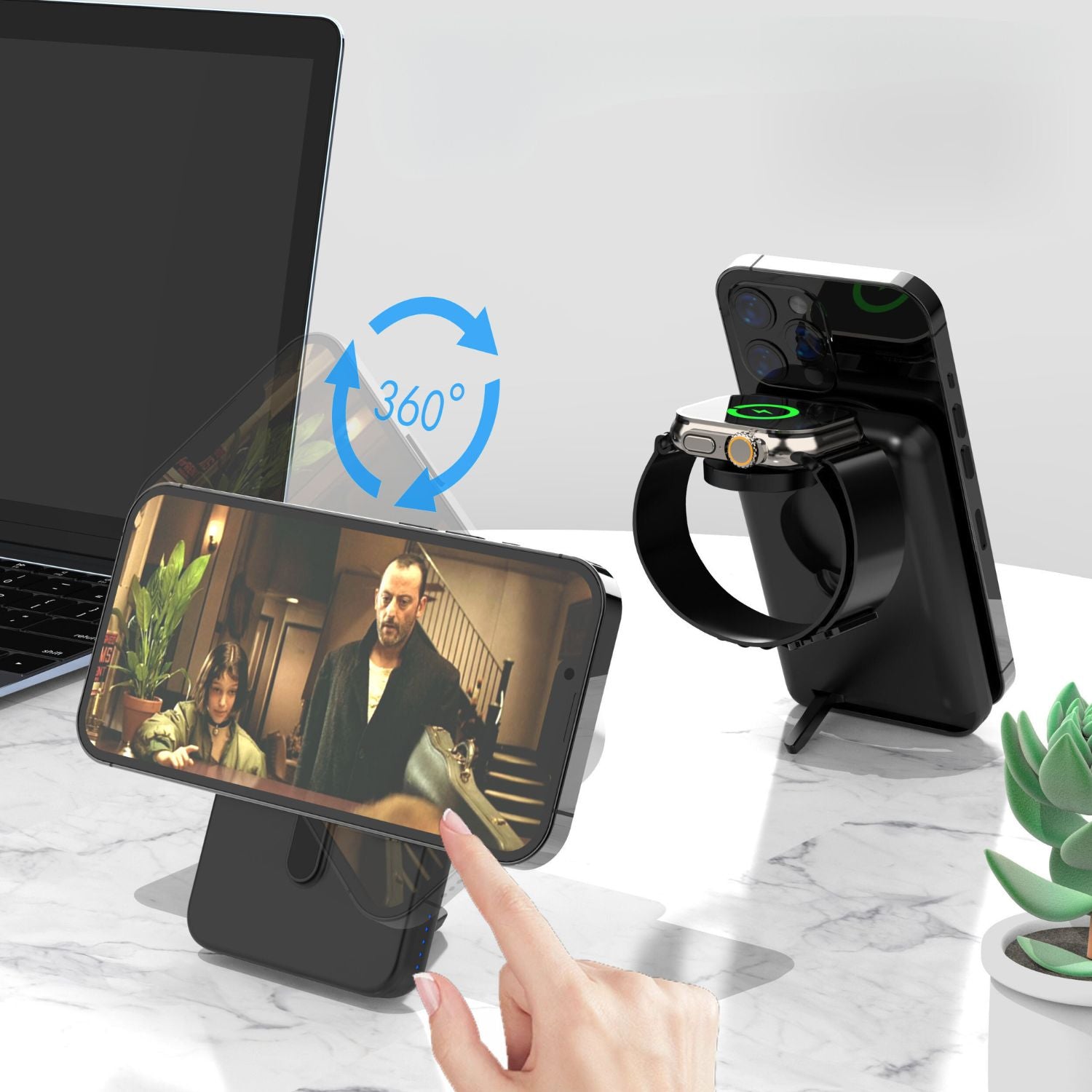 Experience the freedom of a charging solution that adapts to you. Our innovative charging station is built for those who don’t stand still, offering fast, efficient power to your iPhone, Apple Watch, and AirPods. Whether you’re juggling tasks in the office, enjoying downtime at a cafe, or simply relaxing at home, stay effortlessly connected and charged. Life is unpredictable; your power source shouldn't be.