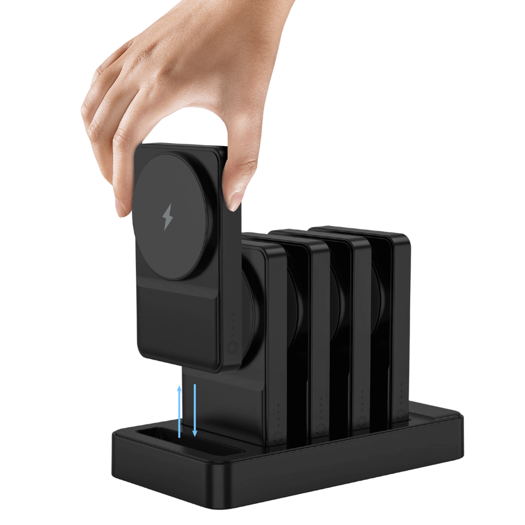 Dock charges all 5× 5000mAh power banks at once — always ready when you are.